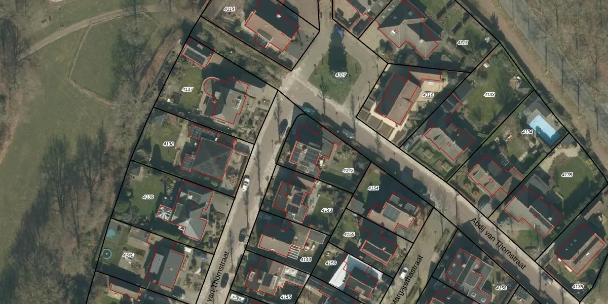 Het perceel waarop Abdij van Thornstraat 22 staat heeft een oppervlakte van 429 m². Dit is een groot perceel. De perceeloppervlakte wordt geregistreerd door het Kadaster. Gedetailleerde informatie over de maten van dit perceel kunt u vinden in het rapport Kadastrale kaart met maatvoering van Abdij van Thornstraat 22.