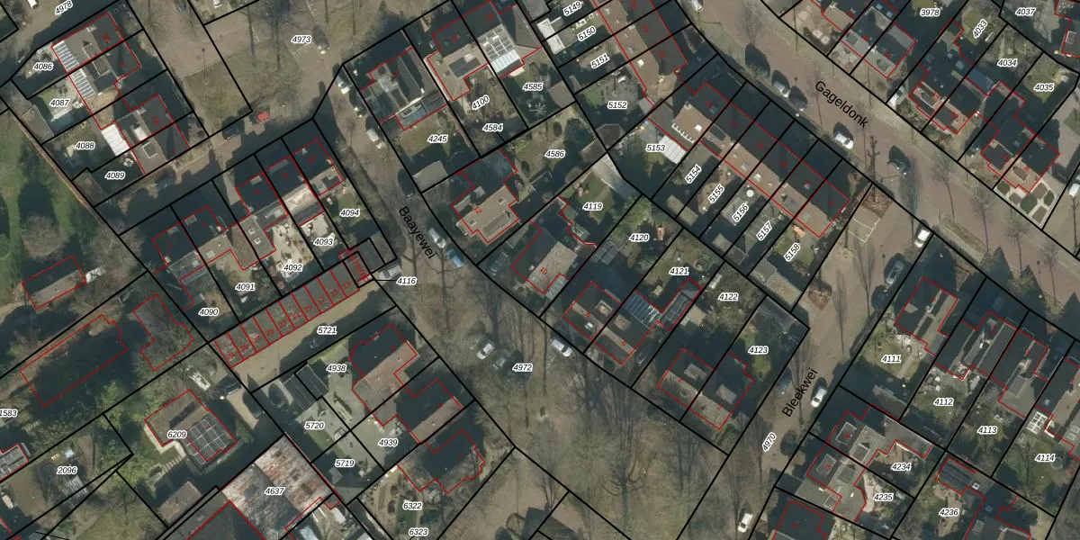 Baayewei 10 is gelegen op kadastraal perceel GNK01K4119. Deze kadastrale aanduiding is uniek en wordt gebruikt door het Kadaster om eigendomsrechten en andere zakelijke rechten vast te leggen. Het perceel maakt onderdeel uit van de kadastrale gemeente Nieuw-Ginneken.
