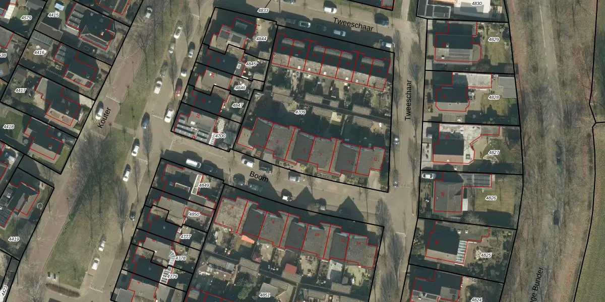 Het perceel waarop Boom 5 staat heeft een oppervlakte van 2082 m². Dit is een zeer groot perceel. De perceeloppervlakte wordt geregistreerd door het Kadaster. Gedetailleerde informatie over de maten van dit perceel kunt u vinden in het rapport Kadastrale kaart met maatvoering van Boom 5.