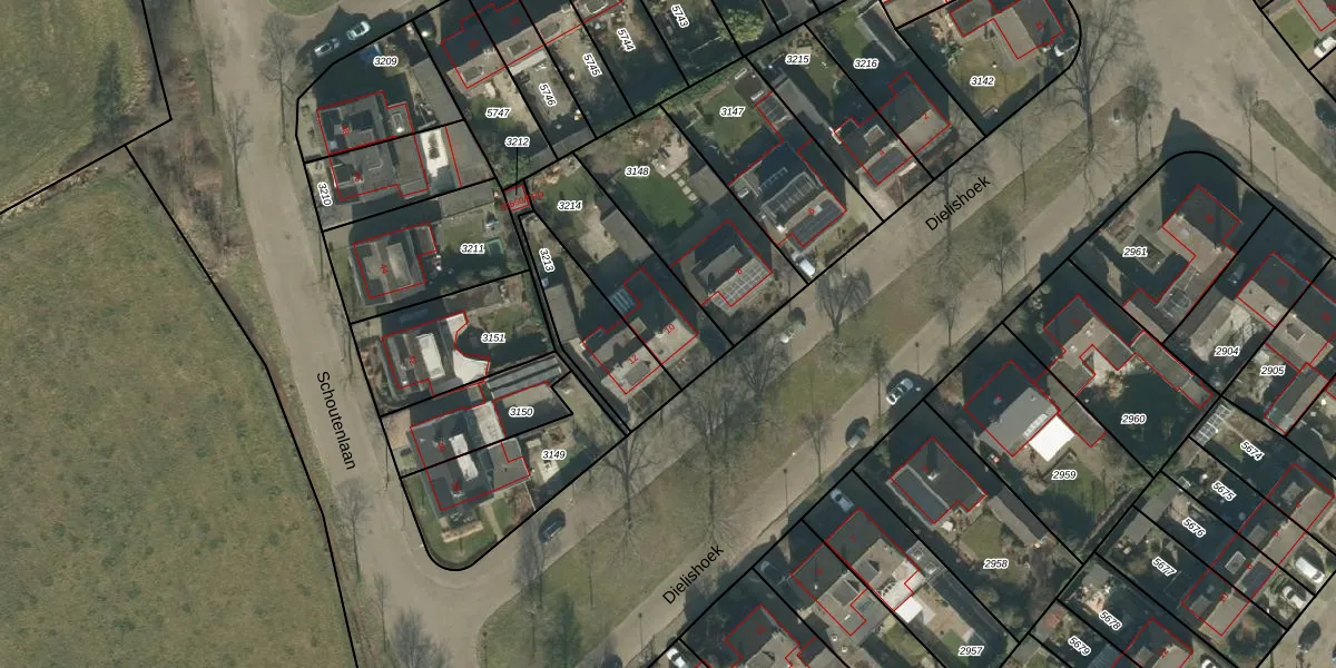 Het perceel waarop Dielishoek 10 staat heeft een oppervlakte van 383 m². Dit is een groot perceel. De perceeloppervlakte wordt geregistreerd door het Kadaster. Gedetailleerde informatie over de maten van dit perceel kunt u vinden in het rapport Kadastrale kaart met maatvoering van Dielishoek 10.