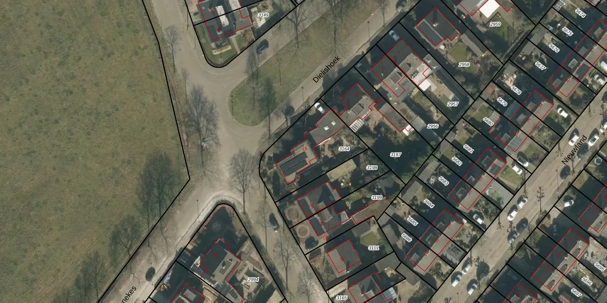 Het perceel waarop Dielishoek 13 staat heeft een oppervlakte van 610 m². Dit is een groot perceel. De perceeloppervlakte wordt geregistreerd door het Kadaster. Gedetailleerde informatie over de maten van dit perceel kunt u vinden in het rapport Kadastrale kaart met maatvoering van Dielishoek 13.