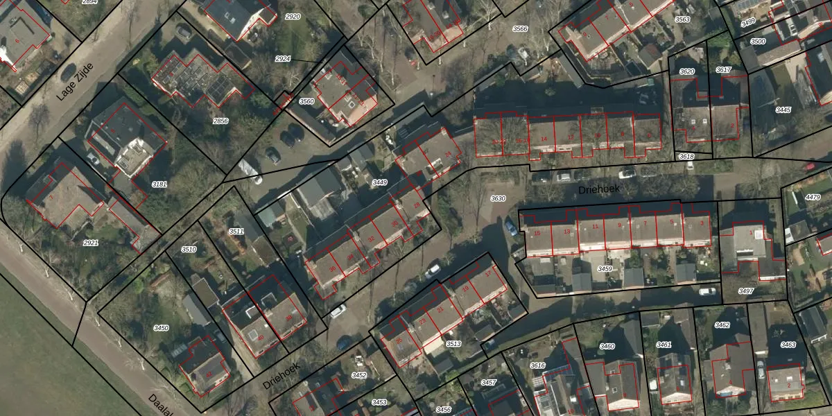 Het perceel waarop Driehoek 28 staat heeft een oppervlakte van 2435 m². Dit is een zeer groot perceel. De perceeloppervlakte wordt geregistreerd door het Kadaster. Gedetailleerde informatie over de maten van dit perceel kunt u vinden in het rapport Kadastrale kaart met maatvoering van Driehoek 28.
