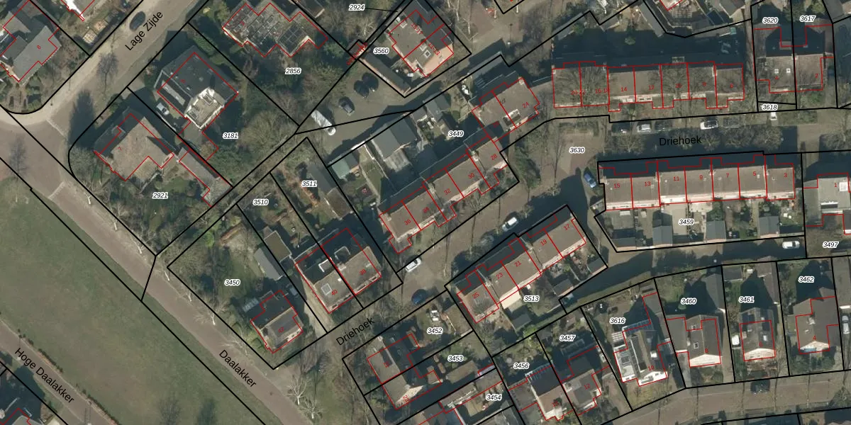Het perceel waarop Driehoek 34 staat heeft een oppervlakte van 2435 m². Dit is een zeer groot perceel. De perceeloppervlakte wordt geregistreerd door het Kadaster. Gedetailleerde informatie over de maten van dit perceel kunt u vinden in het rapport Kadastrale kaart met maatvoering van Driehoek 34.