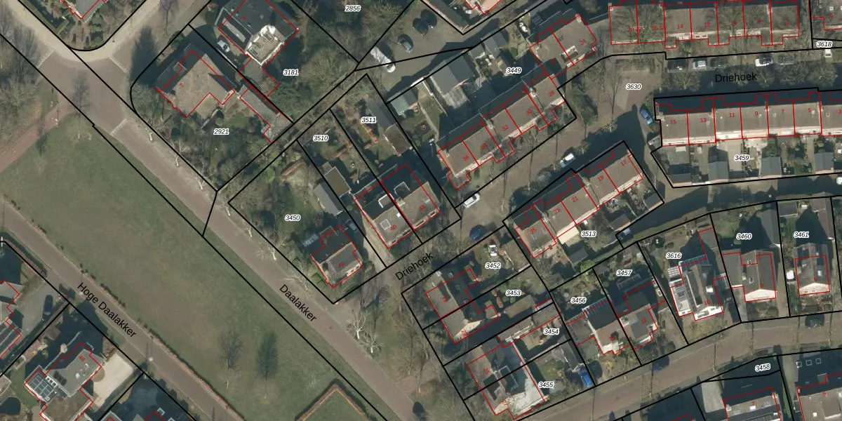 Het perceel waarop Driehoek 38 staat heeft een oppervlakte van 449 m². Dit is een groot perceel. De perceeloppervlakte wordt geregistreerd door het Kadaster. Gedetailleerde informatie over de maten van dit perceel kunt u vinden in het rapport Kadastrale kaart met maatvoering van Driehoek 38.