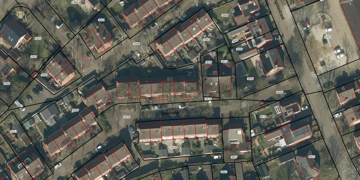 Het perceel waarop Driehoek 8 staat heeft een oppervlakte van 2435 m². Dit is een zeer groot perceel. De perceeloppervlakte wordt geregistreerd door het Kadaster. Gedetailleerde informatie over de maten van dit perceel kunt u vinden in het rapport Kadastrale kaart met maatvoering van Driehoek 8.