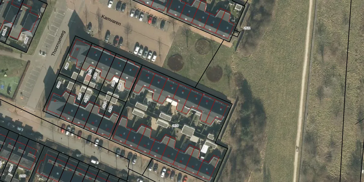 Het perceel waarop Kamvaren 16 staat heeft een oppervlakte van 2582 m². Dit is een zeer groot perceel. De perceeloppervlakte wordt geregistreerd door het Kadaster. Gedetailleerde informatie over de maten van dit perceel kunt u vinden in het rapport Kadastrale kaart met maatvoering van Kamvaren 16.