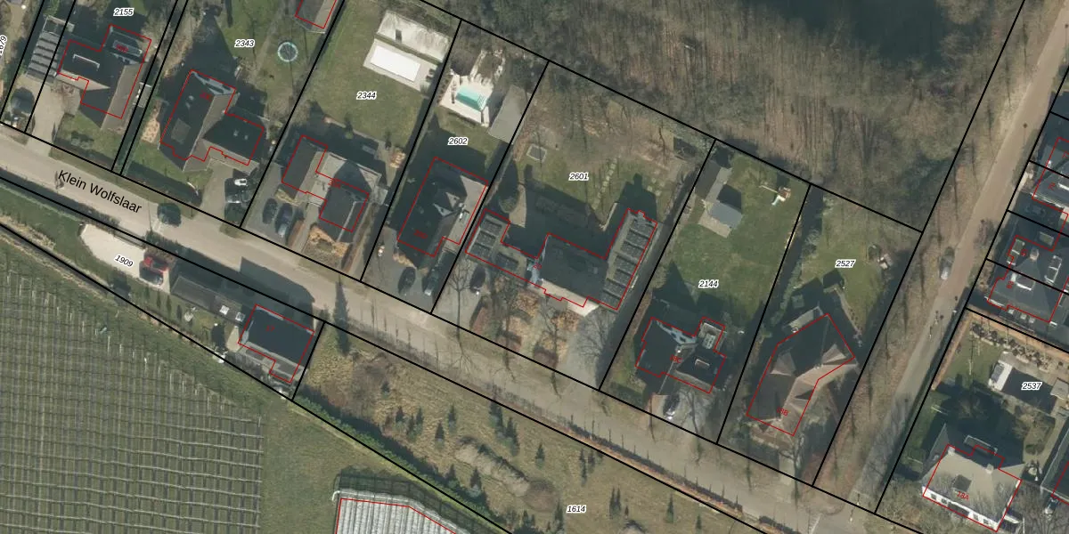 Het perceel waarop Klein Wolfslaar 20 staat heeft een oppervlakte van 1820 m². Dit is een zeer groot perceel. De perceeloppervlakte wordt geregistreerd door het Kadaster. Gedetailleerde informatie over de maten van dit perceel kunt u vinden in het rapport Kadastrale kaart met maatvoering van Klein Wolfslaar 20.