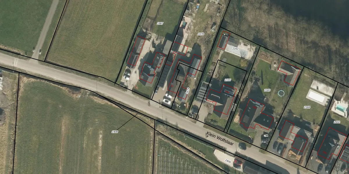 Het perceel waarop Klein Wolfslaar 22 staat heeft een oppervlakte van 1370 m². Dit is een zeer groot perceel. De perceeloppervlakte wordt geregistreerd door het Kadaster. Gedetailleerde informatie over de maten van dit perceel kunt u vinden in het rapport Kadastrale kaart met maatvoering van Klein Wolfslaar 22.