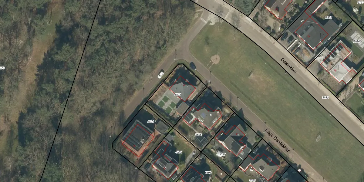 Het perceel waarop Lage Daalakker 2 staat heeft een oppervlakte van 594 m². Dit is een groot perceel. De perceeloppervlakte wordt geregistreerd door het Kadaster. Gedetailleerde informatie over de maten van dit perceel kunt u vinden in het rapport Kadastrale kaart met maatvoering van Lage Daalakker 2.