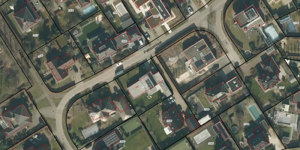 Patrijzenlaar 13-A is gelegen op kadastraal perceel GNK01C2697. Deze kadastrale aanduiding is uniek en wordt gebruikt door het Kadaster om eigendomsrechten en andere zakelijke rechten vast te leggen. Het perceel maakt onderdeel uit van de kadastrale gemeente Nieuw-Ginneken.