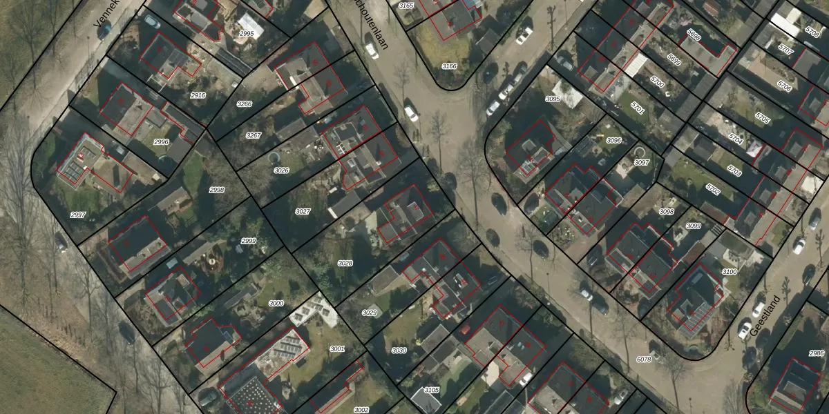 Schoutenlaan 47 is gelegen op kadastraal perceel GNK01K3028. Deze kadastrale aanduiding is uniek en wordt gebruikt door het Kadaster om eigendomsrechten en andere zakelijke rechten vast te leggen. Het perceel maakt onderdeel uit van de kadastrale gemeente Nieuw-Ginneken.