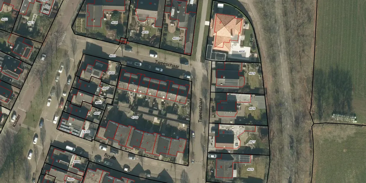 Tweeschaar 21 is gelegen op kadastraal perceel GNK01K4709. Deze kadastrale aanduiding is uniek en wordt gebruikt door het Kadaster om eigendomsrechten en andere zakelijke rechten vast te leggen. Het perceel maakt onderdeel uit van de kadastrale gemeente Nieuw-Ginneken.
