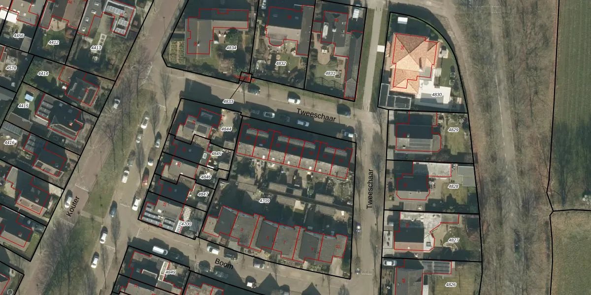 Tweeschaar 27 is gelegen op kadastraal perceel GNK01K4709. Deze kadastrale aanduiding is uniek en wordt gebruikt door het Kadaster om eigendomsrechten en andere zakelijke rechten vast te leggen. Het perceel maakt onderdeel uit van de kadastrale gemeente Nieuw-Ginneken.