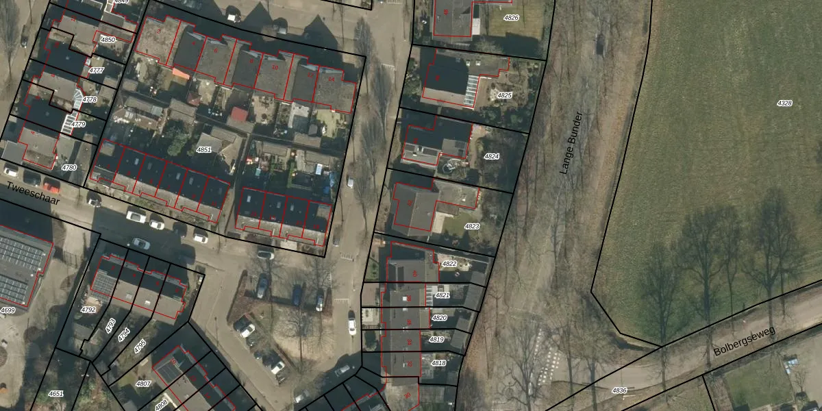 Het perceel waarop Tweeschaar 42 staat heeft een oppervlakte van 493 m². Dit is een groot perceel. De perceeloppervlakte wordt geregistreerd door het Kadaster. Gedetailleerde informatie over de maten van dit perceel kunt u vinden in het rapport Kadastrale kaart met maatvoering van Tweeschaar 42.