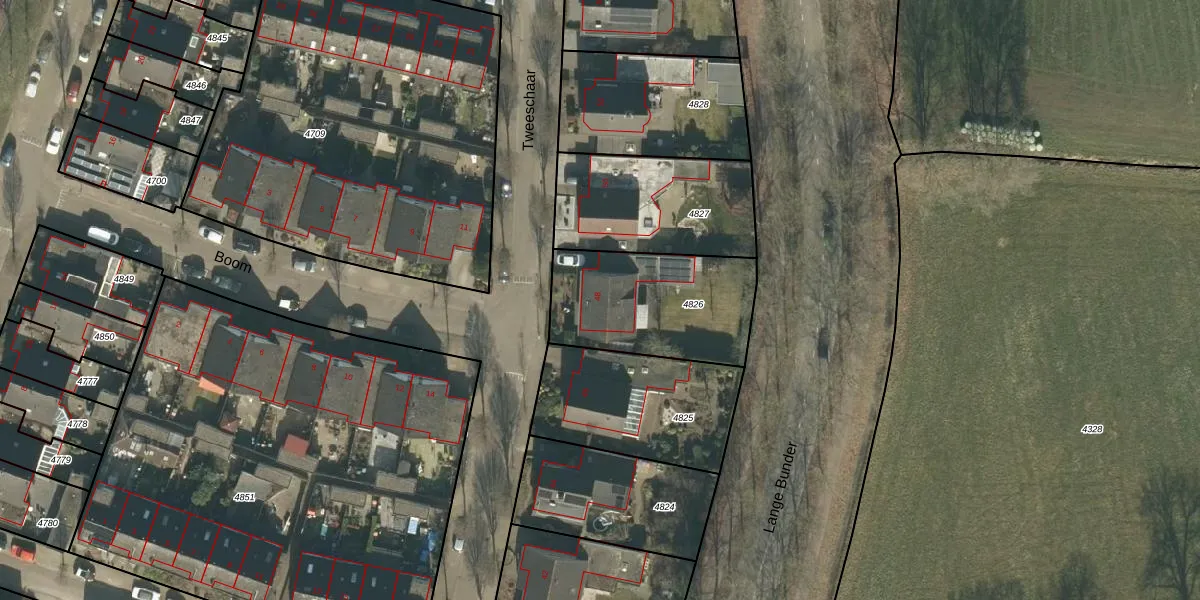 Het perceel waarop Tweeschaar 48 staat heeft een oppervlakte van 572 m². Dit is een groot perceel. De perceeloppervlakte wordt geregistreerd door het Kadaster. Gedetailleerde informatie over de maten van dit perceel kunt u vinden in het rapport Kadastrale kaart met maatvoering van Tweeschaar 48.