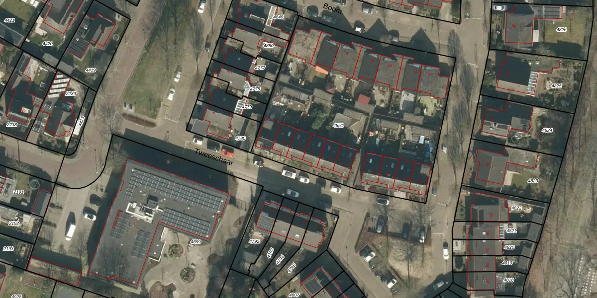 Tweeschaar 5 is gelegen op kadastraal perceel GNK01K4851. Deze kadastrale aanduiding is uniek en wordt gebruikt door het Kadaster om eigendomsrechten en andere zakelijke rechten vast te leggen. Het perceel maakt onderdeel uit van de kadastrale gemeente Nieuw-Ginneken.