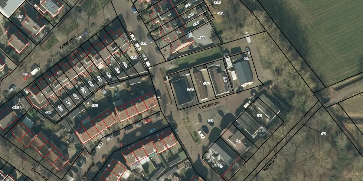 Veldekens 1 is gelegen op kadastraal perceel GNK01M1063. Deze kadastrale aanduiding is uniek en wordt gebruikt door het Kadaster om eigendomsrechten en andere zakelijke rechten vast te leggen. Het perceel maakt onderdeel uit van de kadastrale gemeente Nieuw-Ginneken.