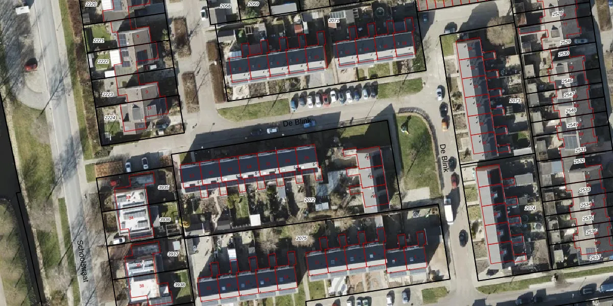 Het perceel waarop De Blink 25 staat heeft een oppervlakte van 2045 m². Dit is een zeer groot perceel. De perceeloppervlakte wordt geregistreerd door het Kadaster. Gedetailleerde informatie over de maten van dit perceel kunt u vinden in het rapport Kadastrale kaart met maatvoering van De Blink 25.