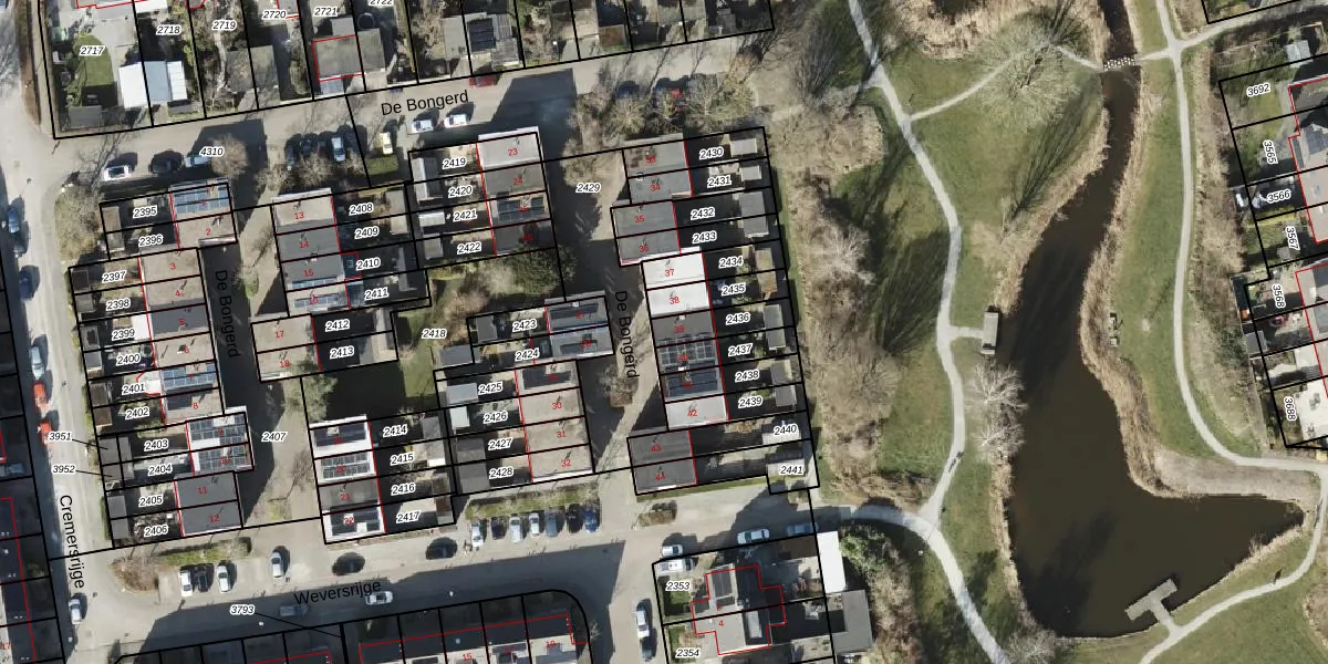 Het perceel waarop De Bongerd 39 staat heeft een oppervlakte van 93 m². Dit is een klein perceel. De perceeloppervlakte wordt geregistreerd door het Kadaster. Gedetailleerde informatie over de maten van dit perceel kunt u vinden in het rapport Kadastrale kaart met maatvoering van De Bongerd 39.