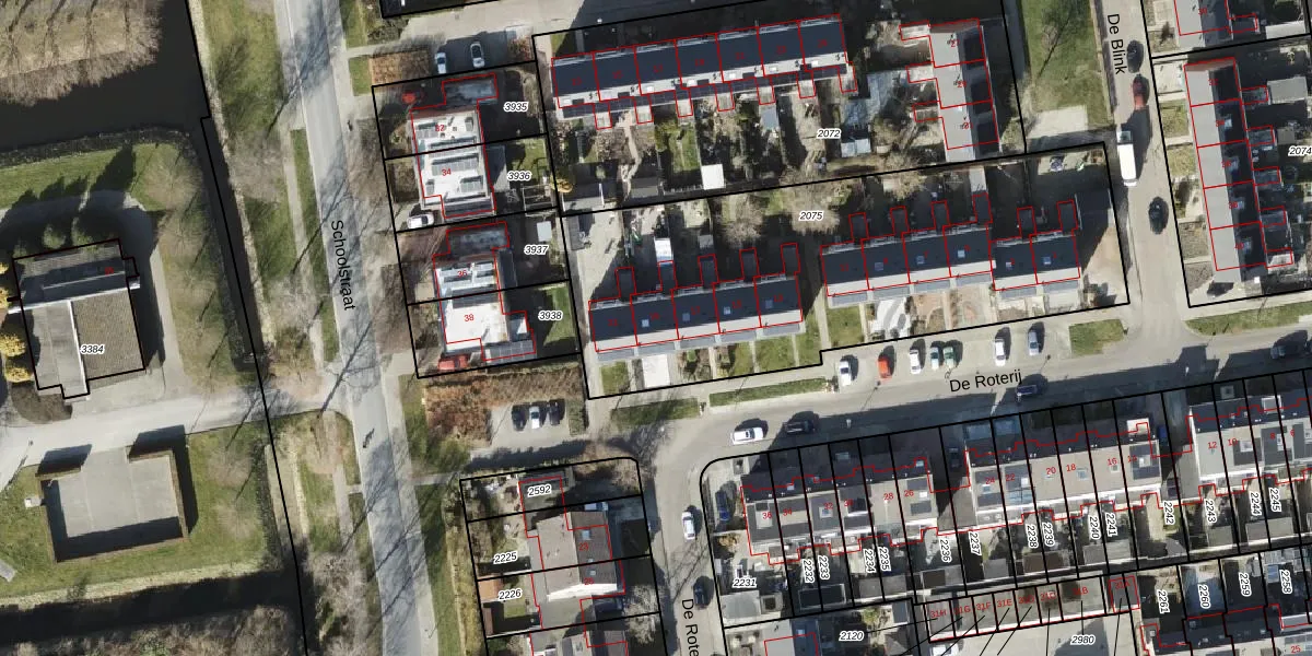 Het perceel waarop De Roterij 19 staat heeft een oppervlakte van 2195 m². Dit is een zeer groot perceel. De perceeloppervlakte wordt geregistreerd door het Kadaster. Gedetailleerde informatie over de maten van dit perceel kunt u vinden in het rapport Kadastrale kaart met maatvoering van De Roterij 19.