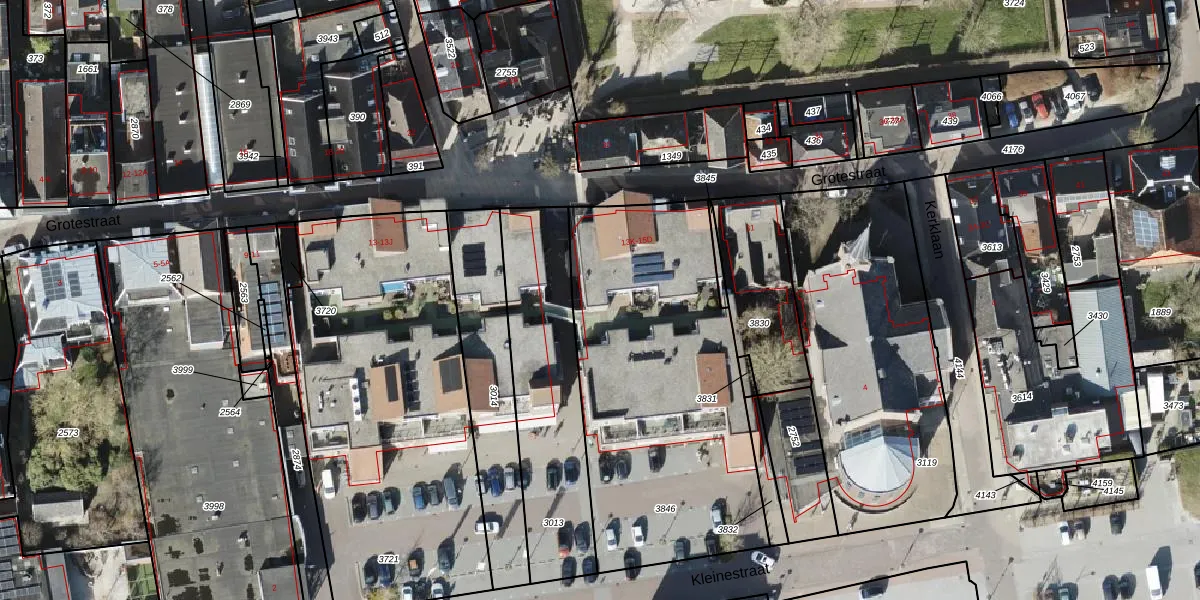 Het perceel waarop Grotestraat 13-R staat heeft een oppervlakte van 1555 m². Dit is een zeer groot perceel. De perceeloppervlakte wordt geregistreerd door het Kadaster. Gedetailleerde informatie over de maten van dit perceel kunt u vinden in het rapport Kadastrale kaart met maatvoering van Grotestraat 13-R.
