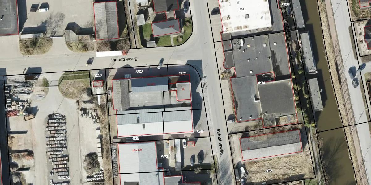 Industrieweg 16 is gelegen op kadastraal perceel BDM00K3807. Deze kadastrale aanduiding is uniek en wordt gebruikt door het Kadaster om eigendomsrechten en andere zakelijke rechten vast te leggen. Het perceel maakt onderdeel uit van de kadastrale gemeente Bedum.
