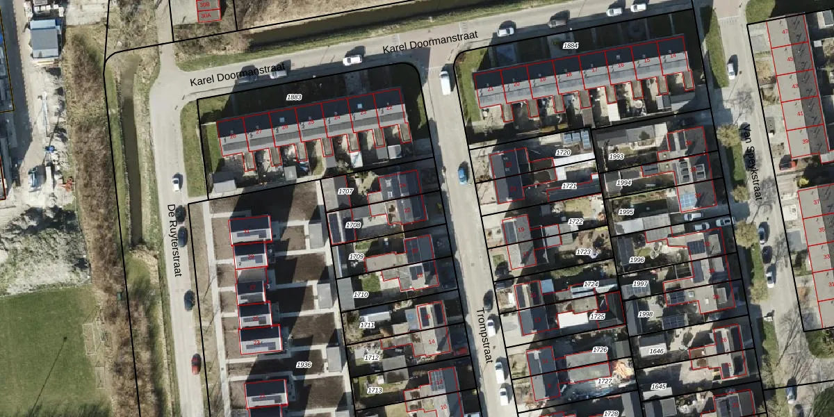 Het perceel waarop Trompstraat 22 staat heeft een oppervlakte van 224 m². Dit is een middelgroot perceel. De perceeloppervlakte wordt geregistreerd door het Kadaster. Gedetailleerde informatie over de maten van dit perceel kunt u vinden in het rapport Kadastrale kaart met maatvoering van Trompstraat 22.