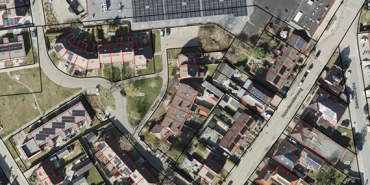 Veeno 9-A is gelegen op kadastraal perceel BDM00K3471. Deze kadastrale aanduiding is uniek en wordt gebruikt door het Kadaster om eigendomsrechten en andere zakelijke rechten vast te leggen. Het perceel maakt onderdeel uit van de kadastrale gemeente Bedum.