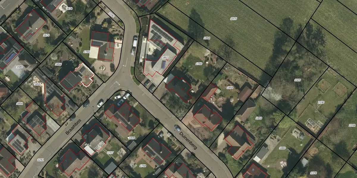 Het perceel waarop Duinenberg 12 staat heeft een oppervlakte van 885 m². Dit is een groot perceel. De perceeloppervlakte wordt geregistreerd door het Kadaster. Gedetailleerde informatie over de maten van dit perceel kunt u vinden in het rapport Kadastrale kaart met maatvoering van Duinenberg 12.