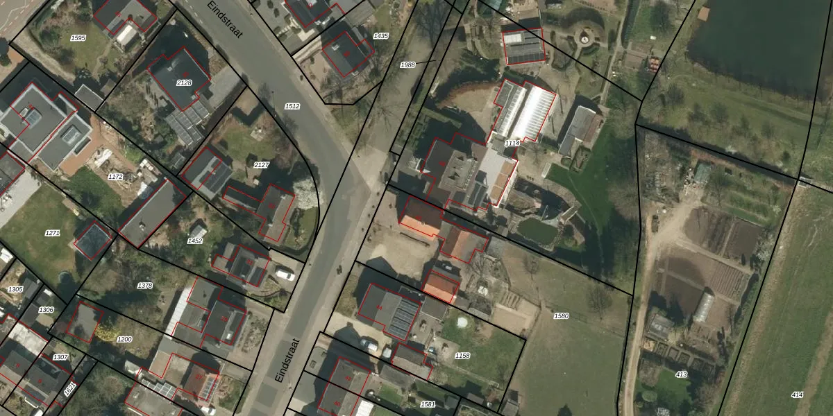 Het perceel waarop Eindstraat 46 staat heeft een oppervlakte van 1875 m². Dit is een zeer groot perceel. De perceeloppervlakte wordt geregistreerd door het Kadaster. Gedetailleerde informatie over de maten van dit perceel kunt u vinden in het rapport Kadastrale kaart met maatvoering van Eindstraat 46.