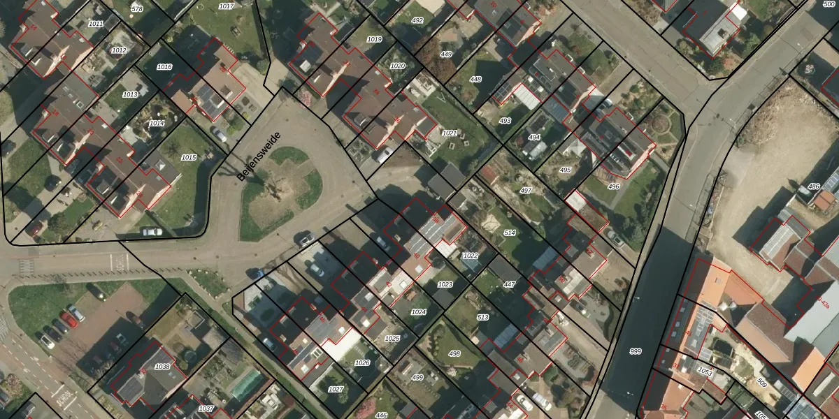 Het perceel waarop Beijensweide 38 staat heeft een oppervlakte van 406 m². Dit is een groot perceel. De perceeloppervlakte wordt geregistreerd door het Kadaster. Gedetailleerde informatie over de maten van dit perceel kunt u vinden in het rapport Kadastrale kaart met maatvoering van Beijensweide 38.