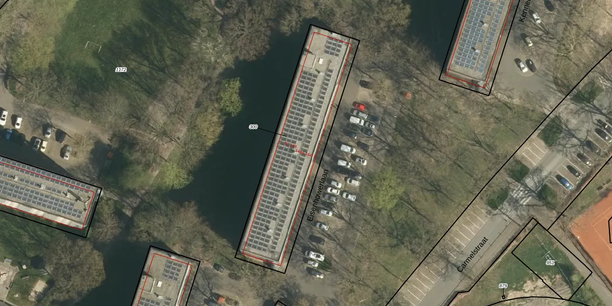 Het perceel waarop Eisenhowerlaan 119 staat heeft een oppervlakte van 1350 m². Dit is een zeer groot perceel. De perceeloppervlakte wordt geregistreerd door het Kadaster. Gedetailleerde informatie over de maten van dit perceel kunt u vinden in het rapport Kadastrale kaart met maatvoering van Eisenhowerlaan 119.
