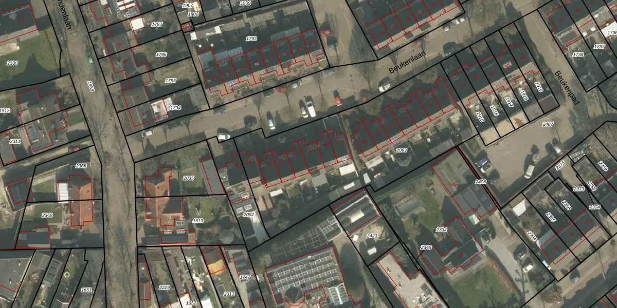 Beukenlaan 91 is gelegen op kadastraal perceel BEE01B2093. Deze kadastrale aanduiding is uniek en wordt gebruikt door het Kadaster om eigendomsrechten en andere zakelijke rechten vast te leggen. Het perceel maakt onderdeel uit van de kadastrale gemeente Beek en Donk.