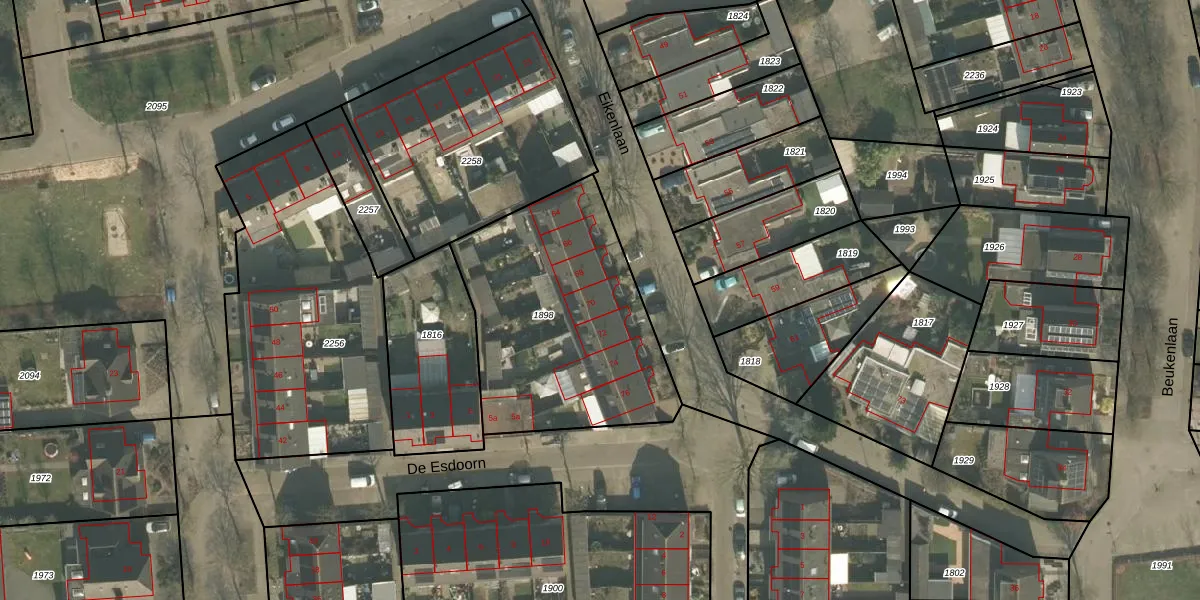 Het perceel waarop Eikenlaan 70 staat heeft een oppervlakte van 1097 m². Dit is een zeer groot perceel. De perceeloppervlakte wordt geregistreerd door het Kadaster. Gedetailleerde informatie over de maten van dit perceel kunt u vinden in het rapport Kadastrale kaart met maatvoering van Eikenlaan 70.
