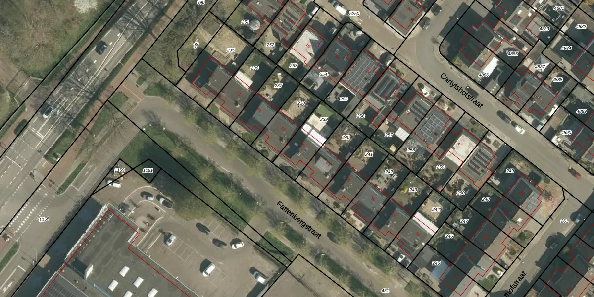 Het perceel waarop Fattenbergstraat 65 staat heeft een oppervlakte van 256 m². Dit is een middelgroot perceel. De perceeloppervlakte wordt geregistreerd door het Kadaster. Gedetailleerde informatie over de maten van dit perceel kunt u vinden in het rapport Kadastrale kaart met maatvoering van Fattenbergstraat 65.
