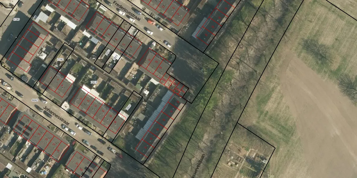 Het perceel waarop Fredericusstraat 25-d staat heeft een oppervlakte van 5078 m². Dit is een zeer groot perceel. De perceeloppervlakte wordt geregistreerd door het Kadaster. Gedetailleerde informatie over de maten van dit perceel kunt u vinden in het rapport Kadastrale kaart met maatvoering van Fredericusstraat 25-d.