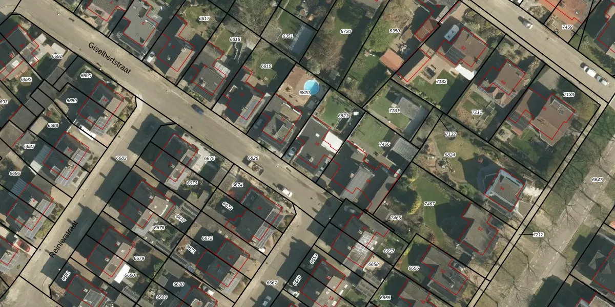 Giselbertstraat 16 is gelegen op kadastraal perceel BEE02B6821. Deze kadastrale aanduiding is uniek en wordt gebruikt door het Kadaster om eigendomsrechten en andere zakelijke rechten vast te leggen. Het perceel maakt onderdeel uit van de kadastrale gemeente Beek.