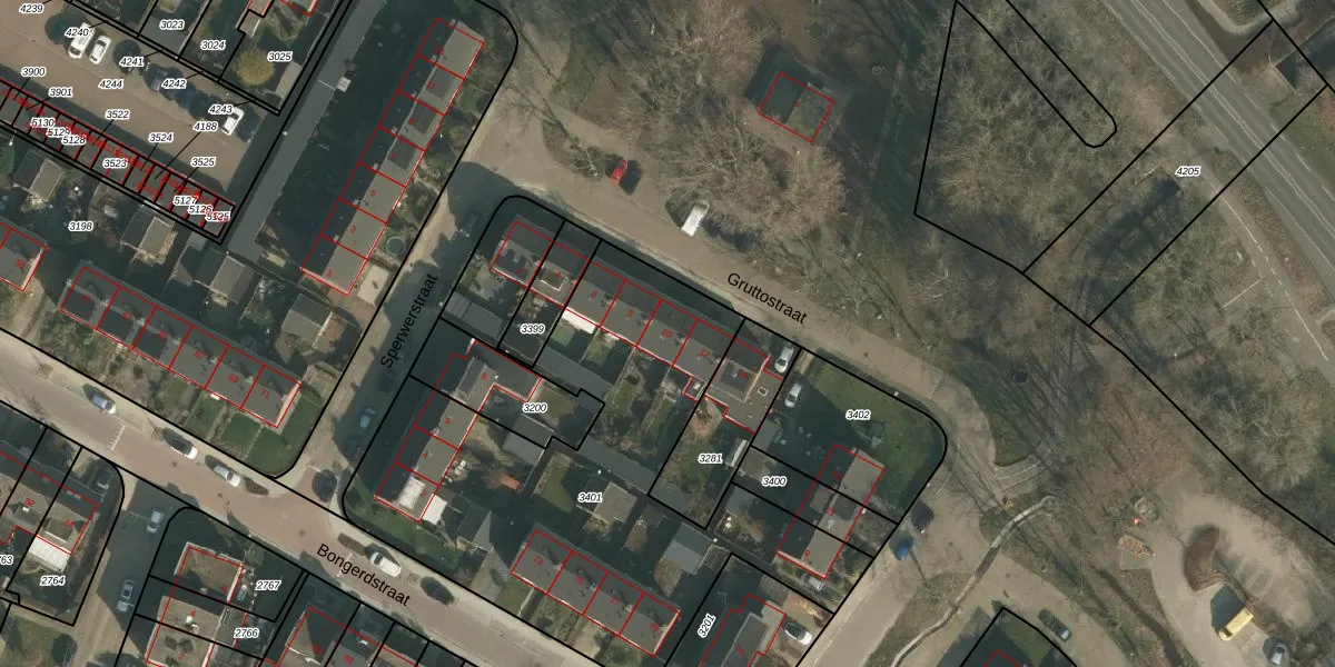 Het perceel waarop Gruttostraat 10 staat heeft een oppervlakte van 2440 m². Dit is een zeer groot perceel. De perceeloppervlakte wordt geregistreerd door het Kadaster. Gedetailleerde informatie over de maten van dit perceel kunt u vinden in het rapport Kadastrale kaart met maatvoering van Gruttostraat 10.