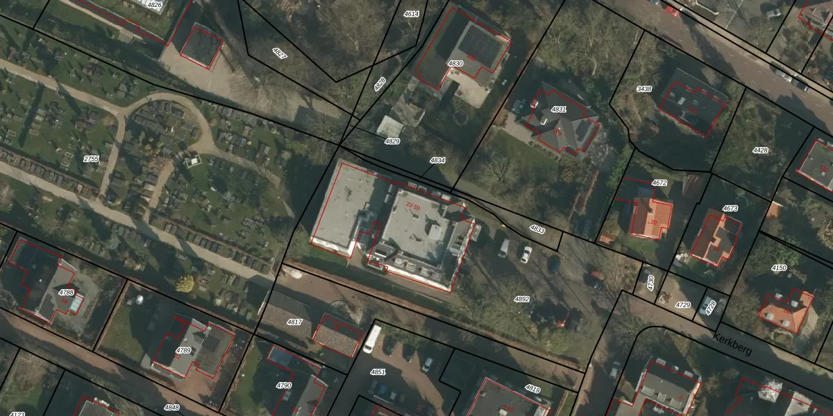 Het perceel waarop Kerkberg 22 staat heeft een oppervlakte van 2260 m². Dit is een zeer groot perceel. De perceeloppervlakte wordt geregistreerd door het Kadaster. Gedetailleerde informatie over de maten van dit perceel kunt u vinden in het rapport Kadastrale kaart met maatvoering van Kerkberg 22.