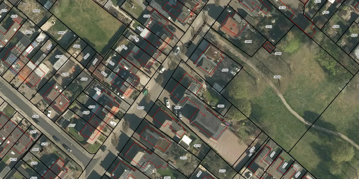 Laurentiusstraat 15 is gelegen op kadastraal perceel BEE02A4967. Deze kadastrale aanduiding is uniek en wordt gebruikt door het Kadaster om eigendomsrechten en andere zakelijke rechten vast te leggen. Het perceel maakt onderdeel uit van de kadastrale gemeente Beek.