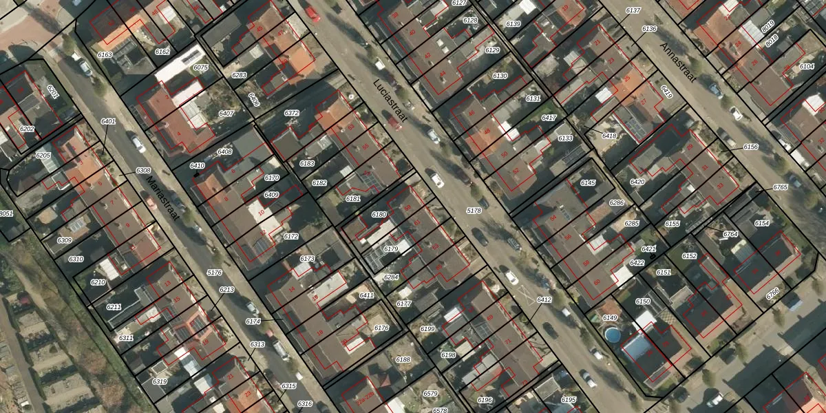 Luciastraat 59 is gelegen op kadastraal perceel BEE02B6180. Deze kadastrale aanduiding is uniek en wordt gebruikt door het Kadaster om eigendomsrechten en andere zakelijke rechten vast te leggen. Het perceel maakt onderdeel uit van de kadastrale gemeente Beek.