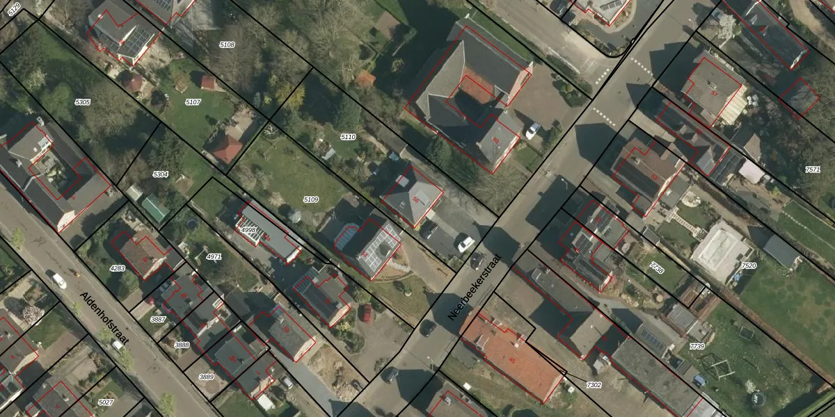 Het perceel waarop Neerbeekerstraat 56 staat heeft een oppervlakte van 960 m². Dit is een groot perceel. De perceeloppervlakte wordt geregistreerd door het Kadaster. Gedetailleerde informatie over de maten van dit perceel kunt u vinden in het rapport Kadastrale kaart met maatvoering van Neerbeekerstraat 56.