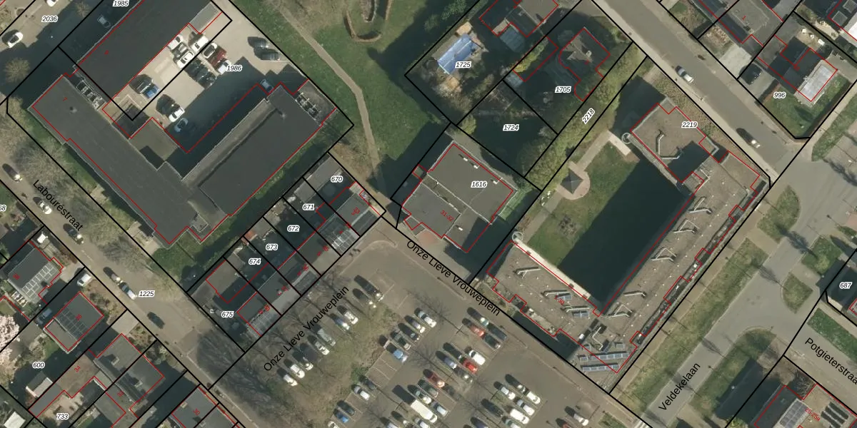 Het perceel waarop Onze Lieve Vrouweplein 31 staat heeft een oppervlakte van 719 m². Dit is een groot perceel. De perceeloppervlakte wordt geregistreerd door het Kadaster. Gedetailleerde informatie over de maten van dit perceel kunt u vinden in het rapport Kadastrale kaart met maatvoering van Onze Lieve Vrouweplein 31.