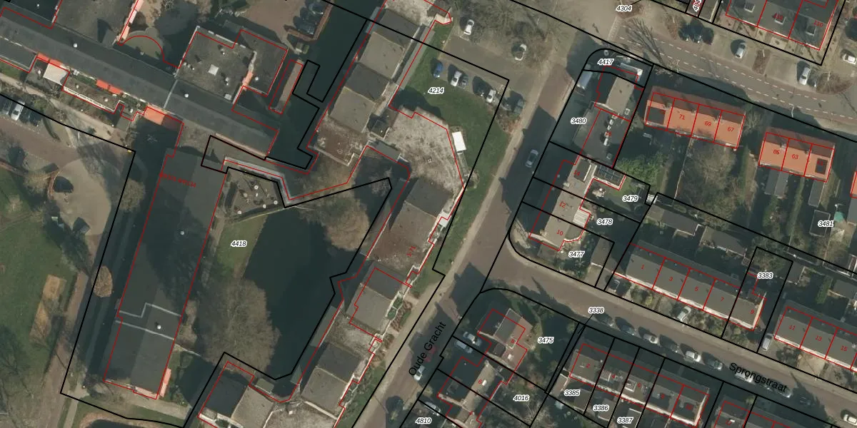 Het perceel waarop Oude Gracht 55 staat heeft een oppervlakte van 3245 m². Dit is een zeer groot perceel. De perceeloppervlakte wordt geregistreerd door het Kadaster. Gedetailleerde informatie over de maten van dit perceel kunt u vinden in het rapport Kadastrale kaart met maatvoering van Oude Gracht 55.