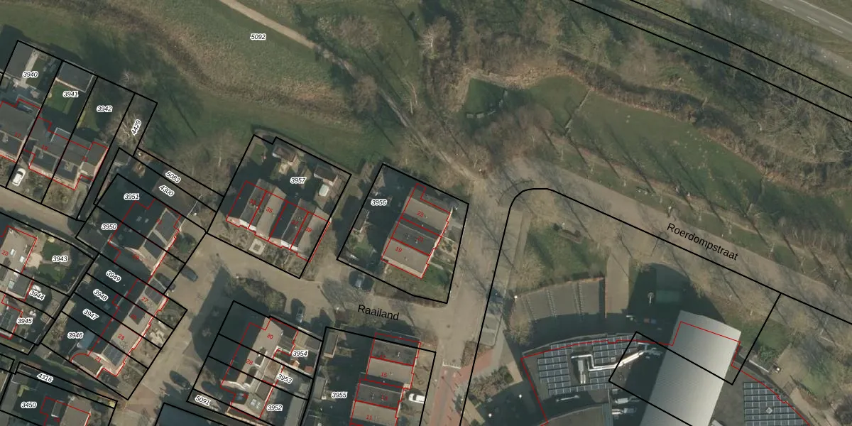 Roerdompstraat 23 is gelegen op kadastraal perceel UBG00B3956. Deze kadastrale aanduiding is uniek en wordt gebruikt door het Kadaster om eigendomsrechten en andere zakelijke rechten vast te leggen. Het perceel maakt onderdeel uit van de kadastrale gemeente Ubbergen.