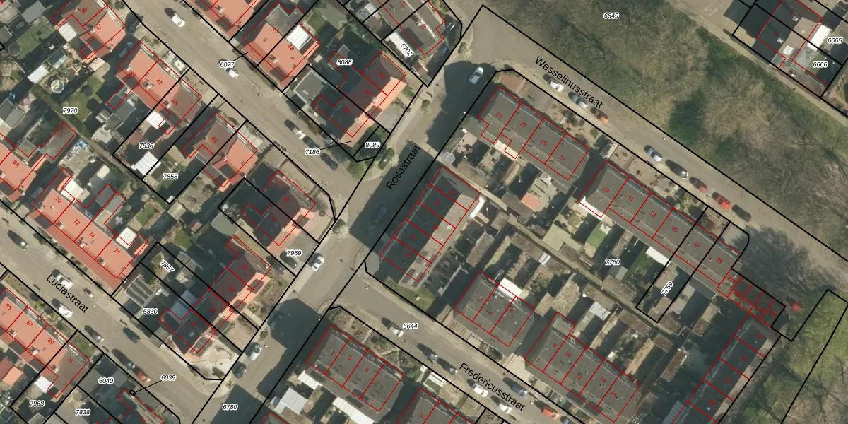 Het perceel waarop Rosastraat 29 staat heeft een oppervlakte van 4963 m². Dit is een zeer groot perceel. De perceeloppervlakte wordt geregistreerd door het Kadaster. Gedetailleerde informatie over de maten van dit perceel kunt u vinden in het rapport Kadastrale kaart met maatvoering van Rosastraat 29.