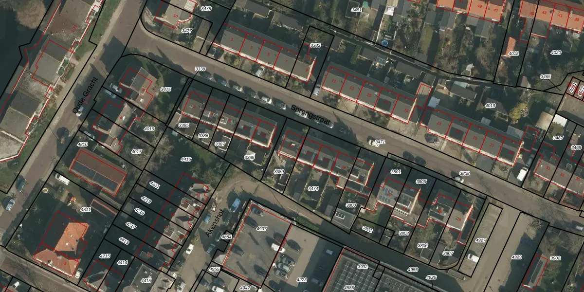 Sprongstraat 12 is gelegen op kadastraal perceel UBG00B3389. Deze kadastrale aanduiding is uniek en wordt gebruikt door het Kadaster om eigendomsrechten en andere zakelijke rechten vast te leggen. Het perceel maakt onderdeel uit van de kadastrale gemeente Ubbergen.