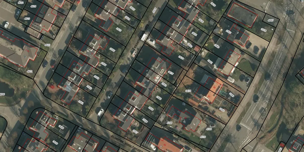 Het perceel waarop Tesselschadestraat 13 staat heeft een oppervlakte van 216 m². Dit is een middelgroot perceel. De perceeloppervlakte wordt geregistreerd door het Kadaster. Gedetailleerde informatie over de maten van dit perceel kunt u vinden in het rapport Kadastrale kaart met maatvoering van Tesselschadestraat 13.