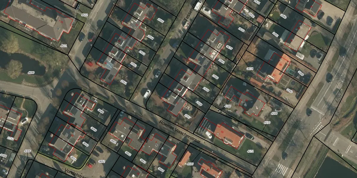Het perceel waarop Tesselschadestraat 19 staat heeft een oppervlakte van 213 m². Dit is een middelgroot perceel. De perceeloppervlakte wordt geregistreerd door het Kadaster. Gedetailleerde informatie over de maten van dit perceel kunt u vinden in het rapport Kadastrale kaart met maatvoering van Tesselschadestraat 19.