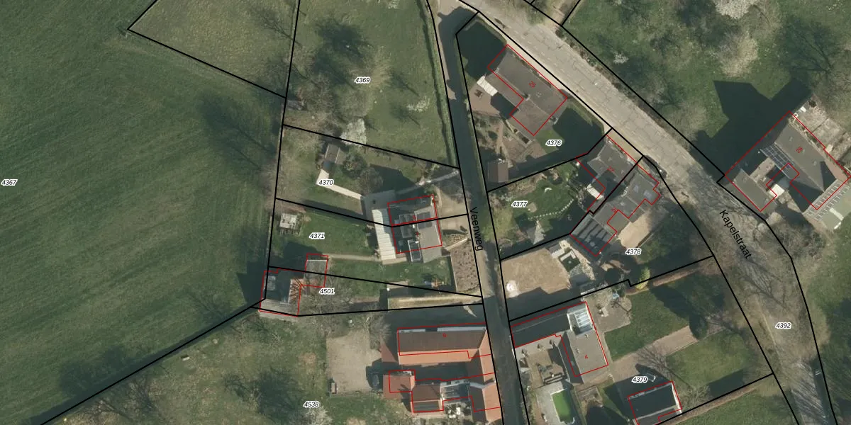 Veenweg 5 is gelegen op kadastraal perceel BEE02F4370. Deze kadastrale aanduiding is uniek en wordt gebruikt door het Kadaster om eigendomsrechten en andere zakelijke rechten vast te leggen. Het perceel maakt onderdeel uit van de kadastrale gemeente Beek.